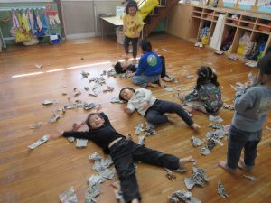 ばなな鬼が楽しかったようで、クラス活動でばなな鬼をした後から、子どもたちは自由遊びの時に必ず「ばなな鬼しよー!」と言って、鬼ごっこ「おおかみさんいまなんじ?」の代わりに、毎日ばなな鬼をするようになりました🍌