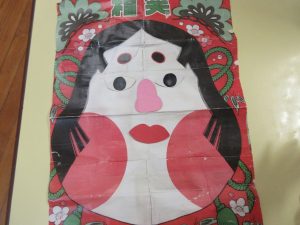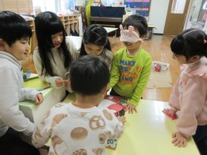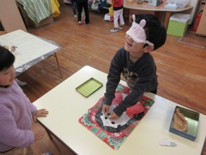 3学期が始まりました🍀新年ということで、保育室にはけん玉・こま・だるま落とし・はねつき等の伝承遊びがたくさんあります。中でもひかり組で人気なのは「福笑い」です。