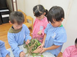 本物のお芋や葉っぱを触ったり、匂ったり…よく観察して、クレパスで遠足の思い出を表現しました🌞