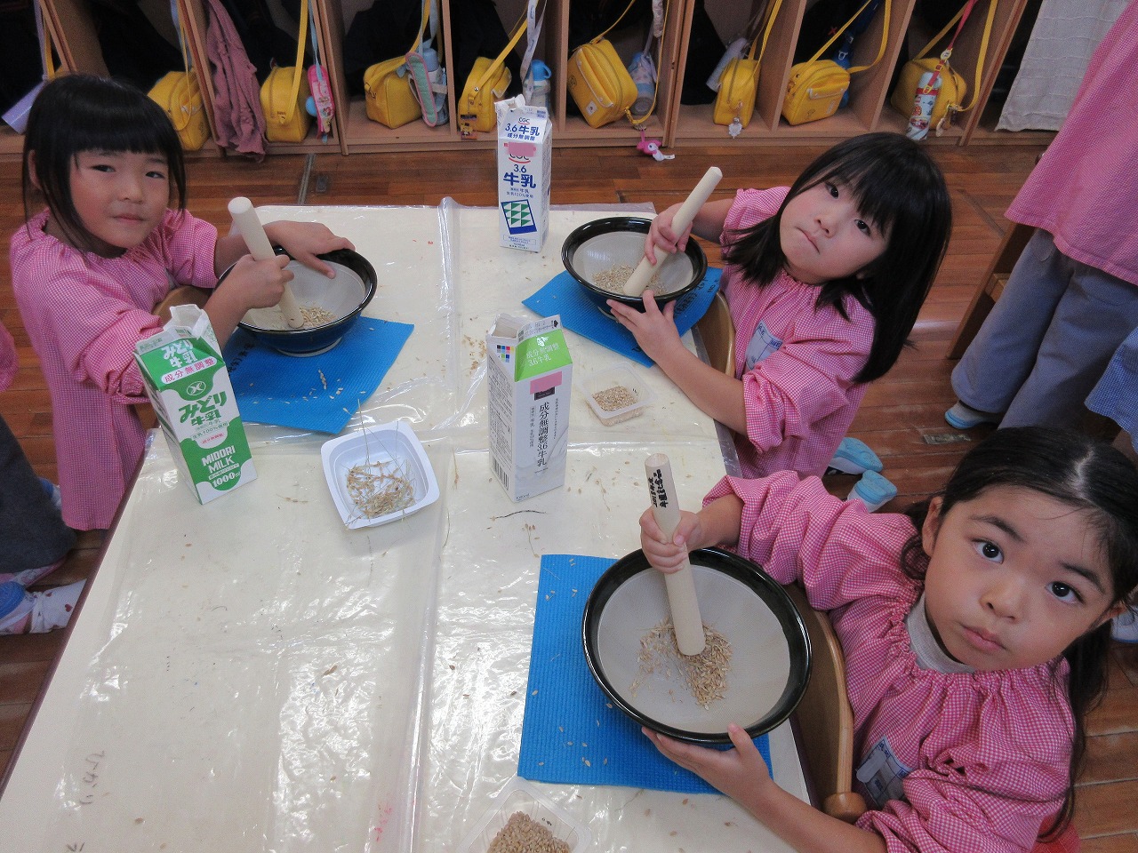 🌾もみすり すりこぎでもみをつぶし、息をそっと吹きかけると殻が飛び、玄米が見えてきました。