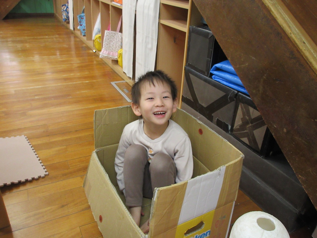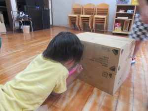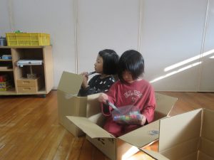 お部屋の椅子やマット、段ボールを使って、お家を作ったり、お風呂に見立てて遊んでいます💺♪