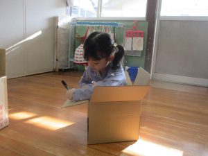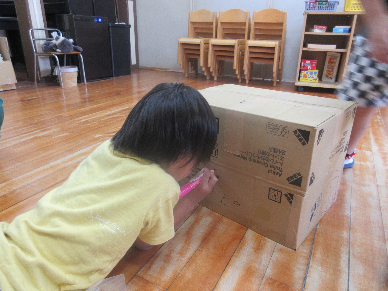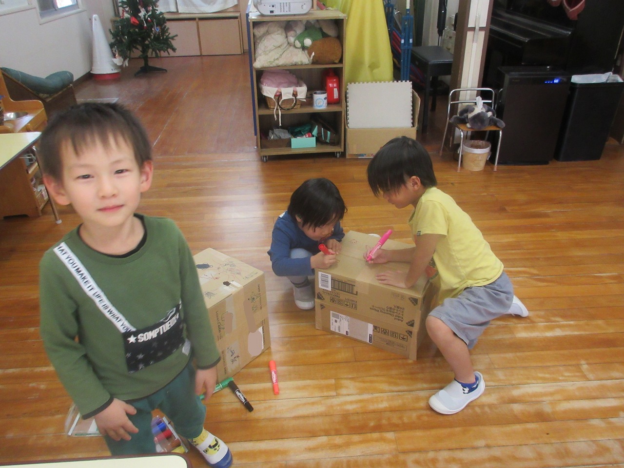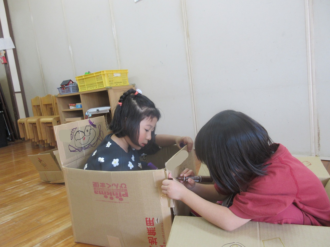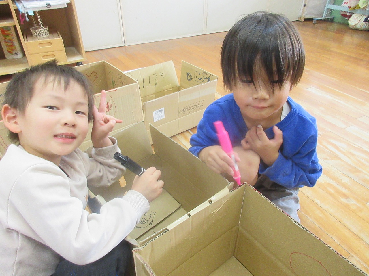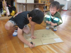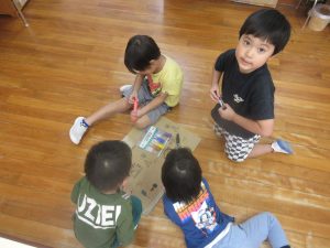 ガムテープを使って段ボールをくっつけたり、ペンでお絵描きをしたり、画用紙を切ったり・・・