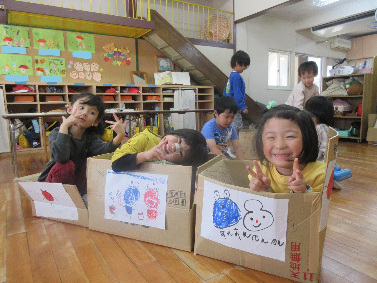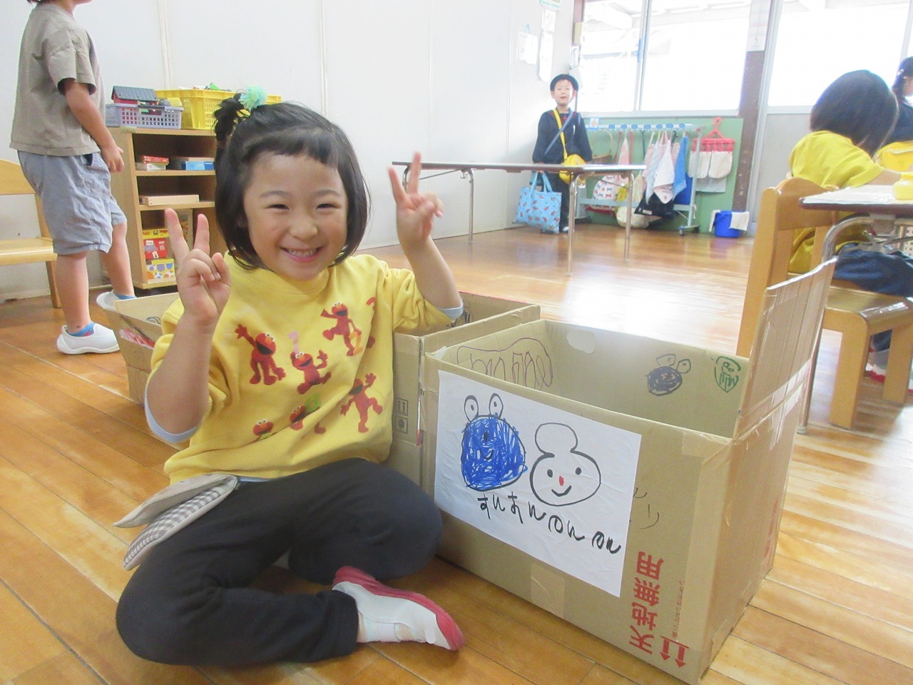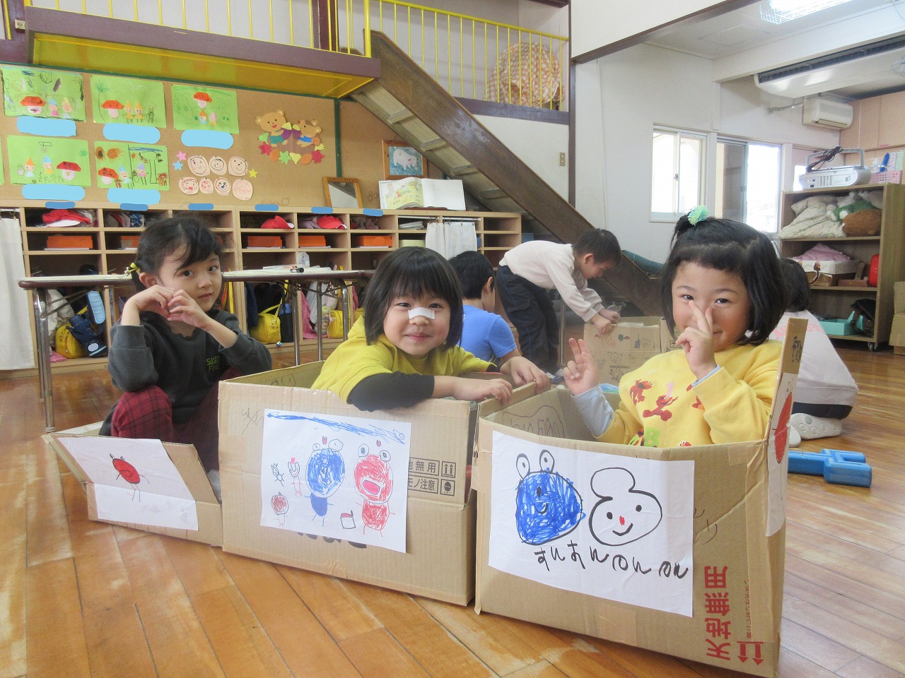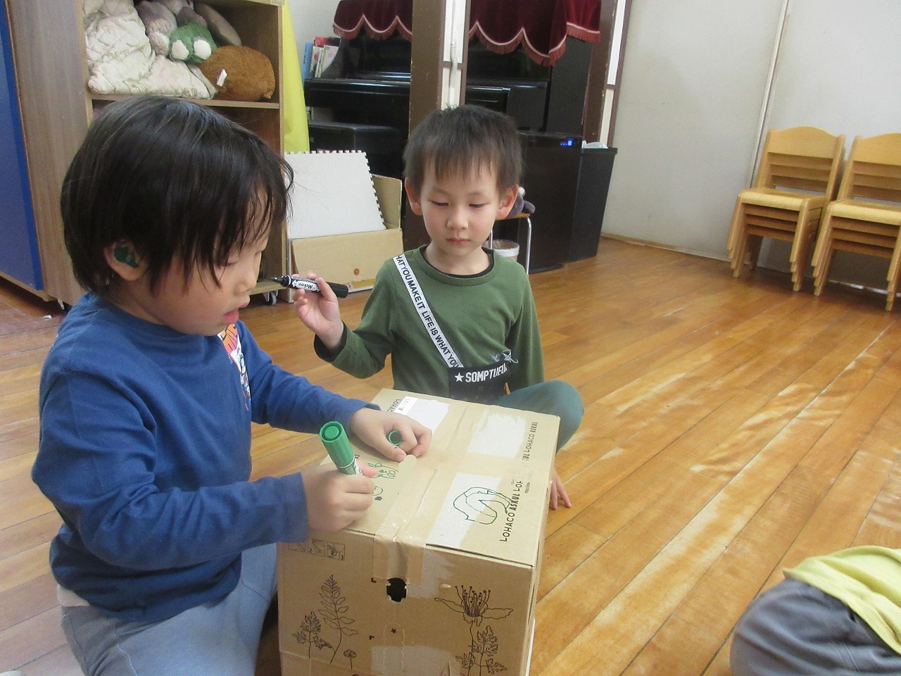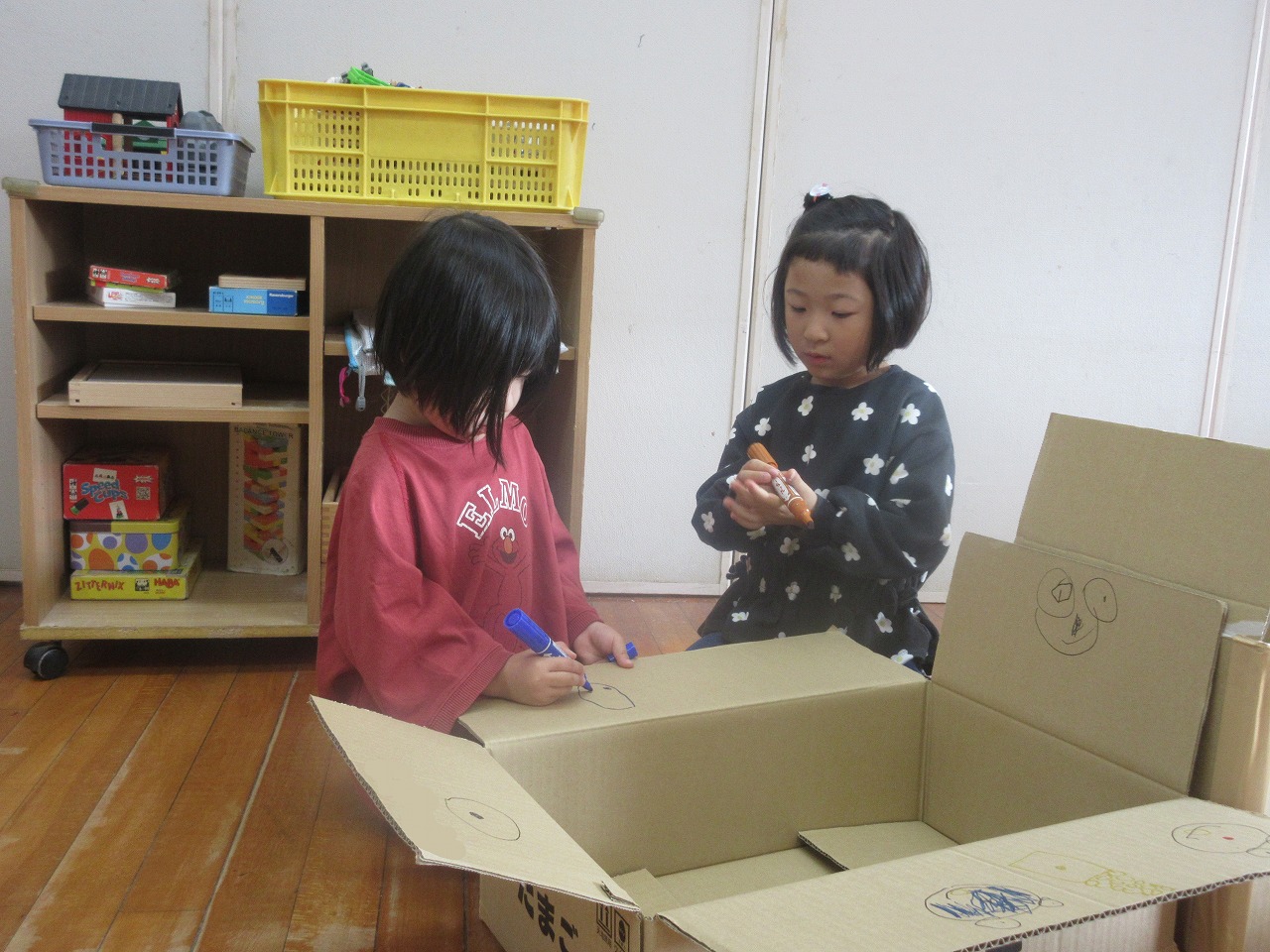 ガムテープを使って段ボールをくっつけたり、ペンでお絵描きをしたり、画用紙を切ったり・・・