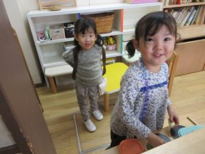 🧡机と椅子を並べて、大好きなお人形で遊びました