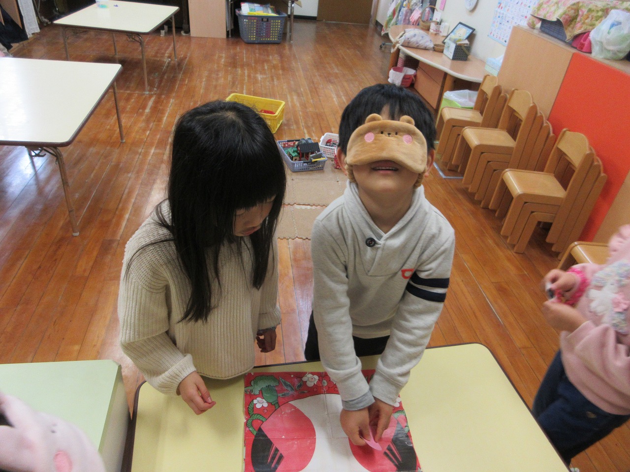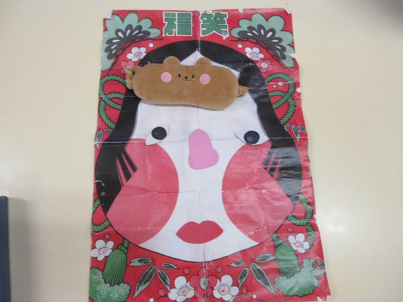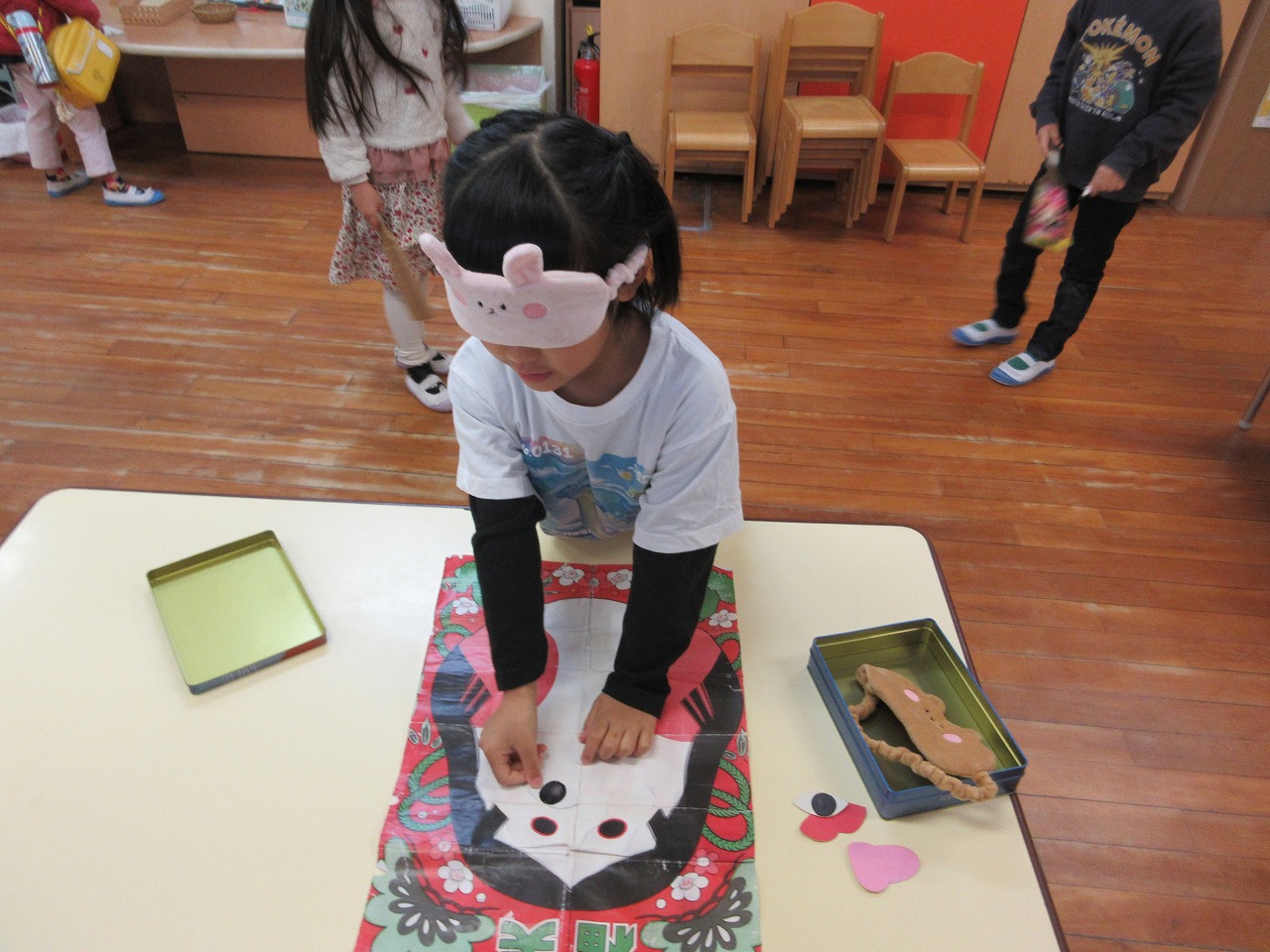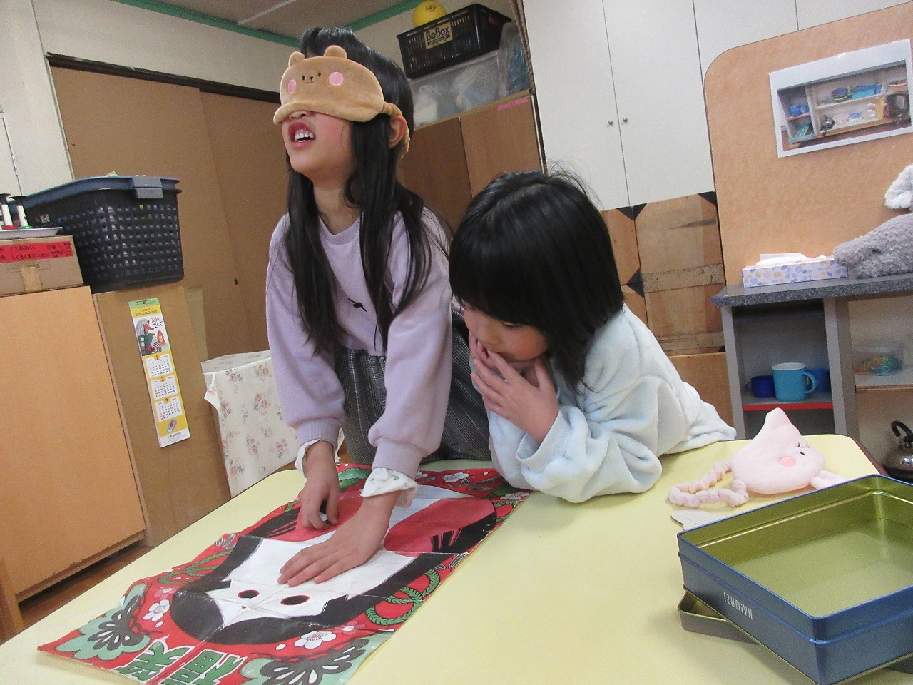 3学期が始まりました🍀新年ということで、保育室にはけん玉・こま・だるま落とし・はねつき等の伝承遊びがたくさんあります。中でもひかり組で人気なのは「福笑い」です。