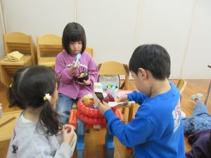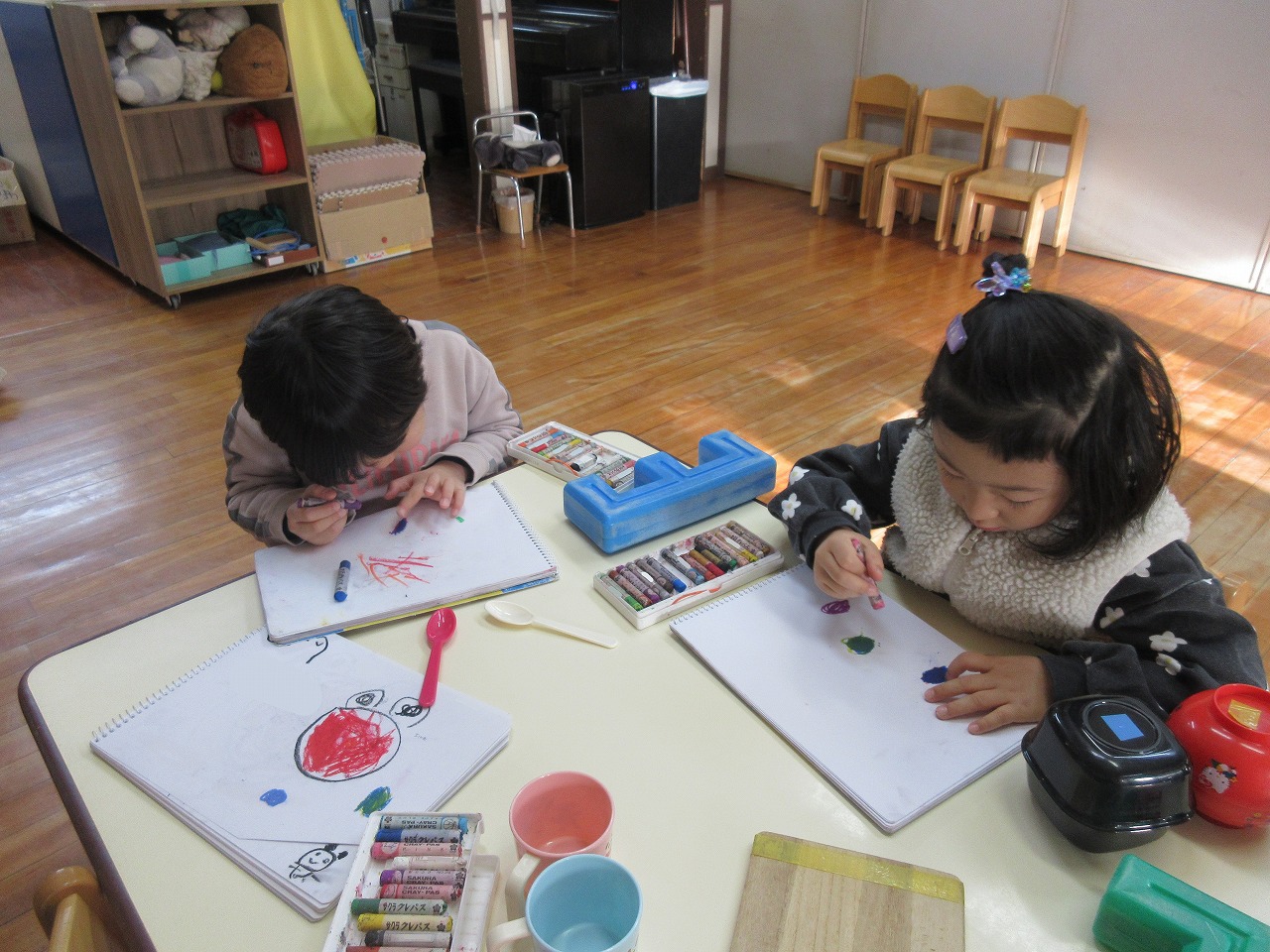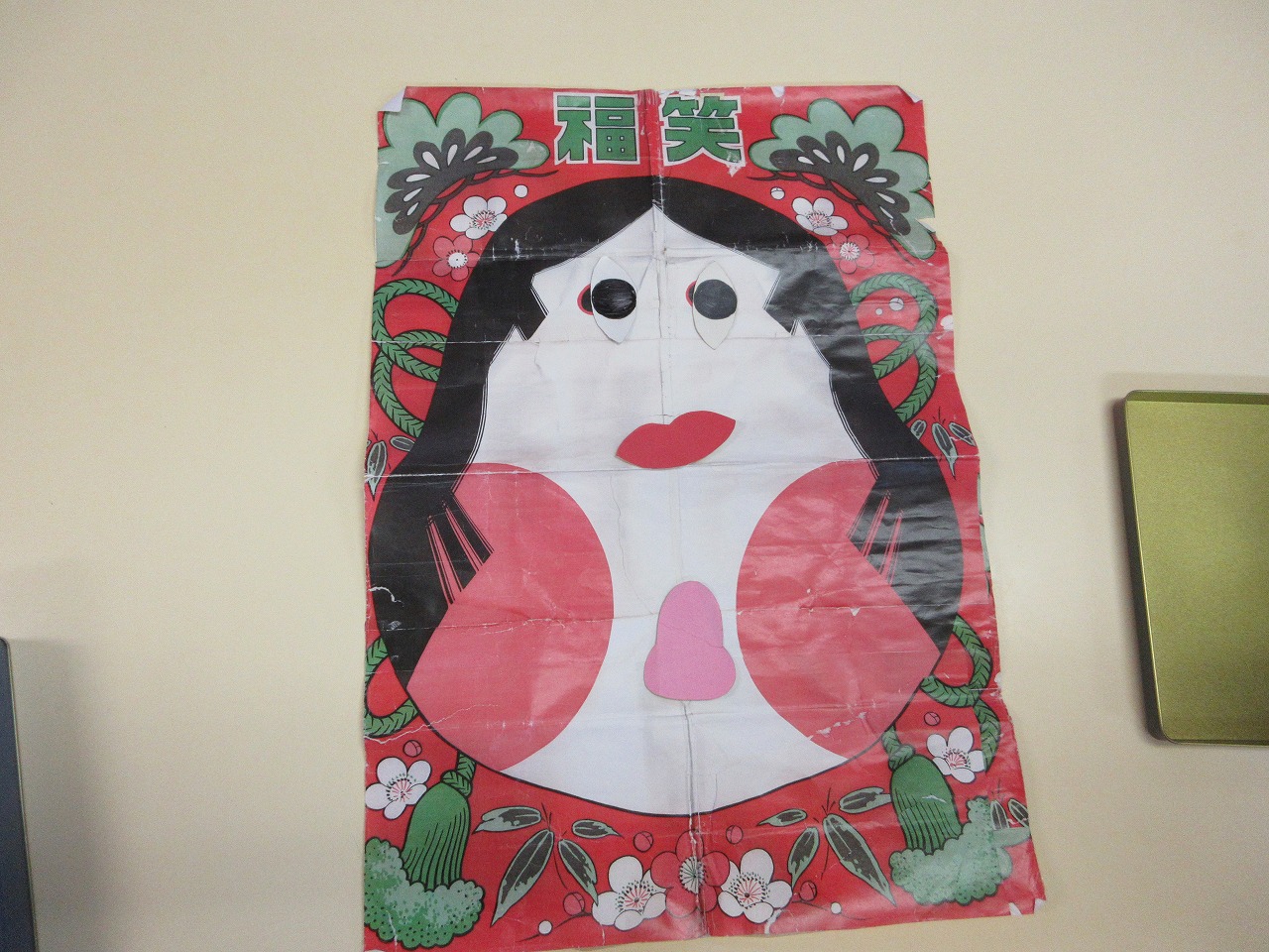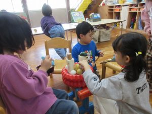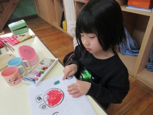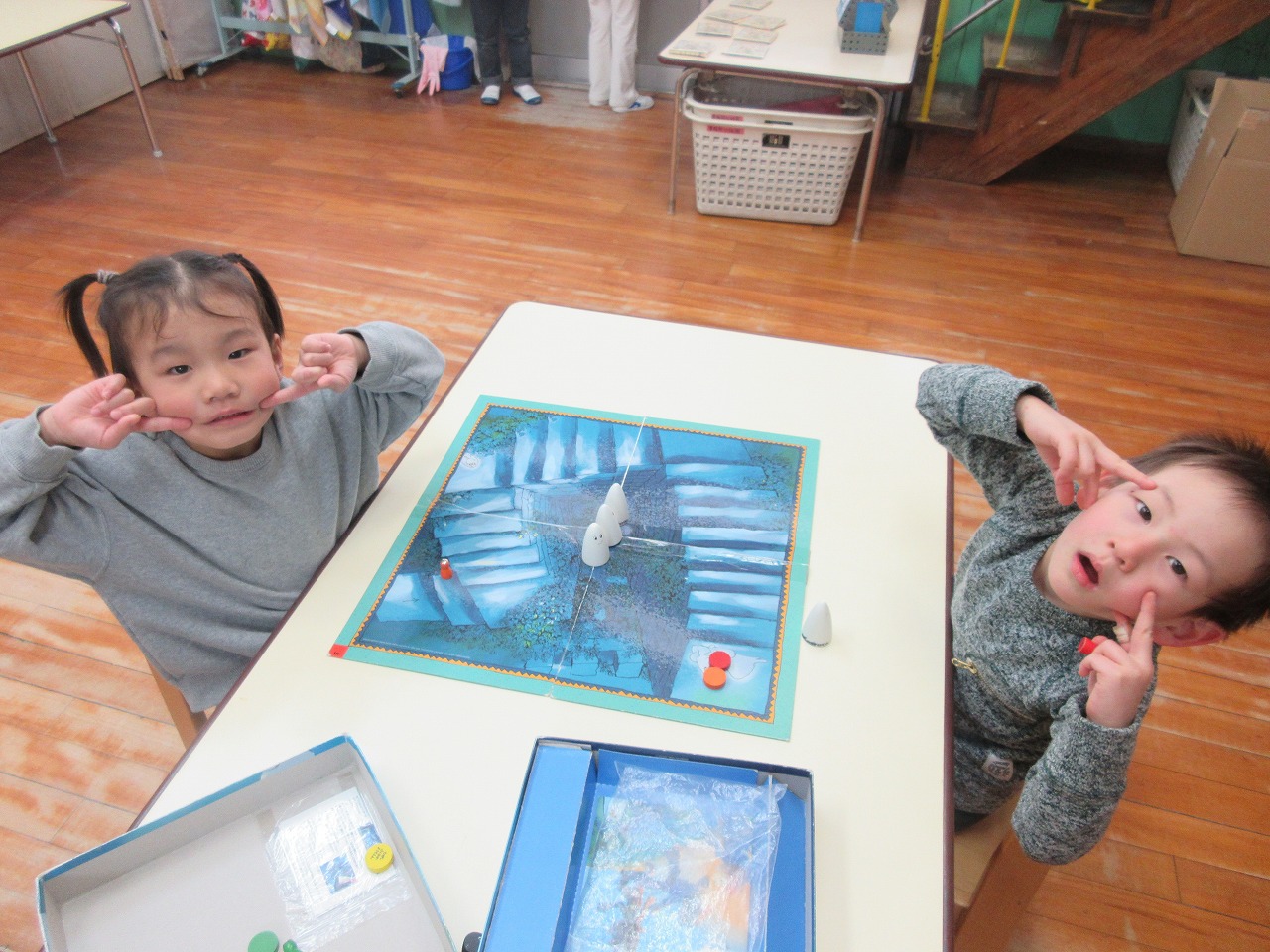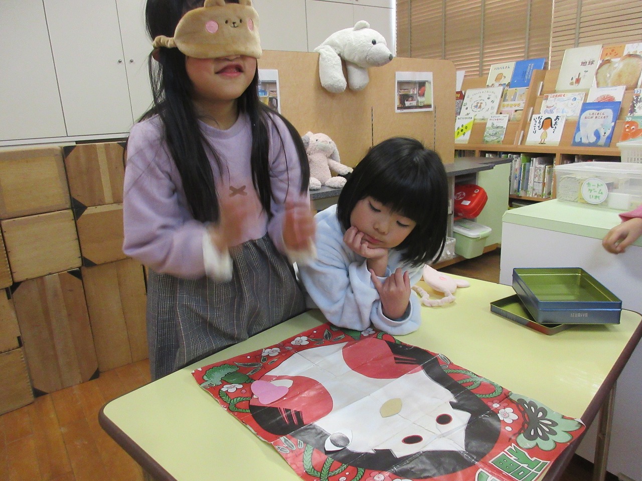 3学期が始まりました🍀新年ということで、保育室にはけん玉・こま・だるま落とし・はねつき等の伝承遊びがたくさんあります。中でもひかり組で人気なのは「福笑い」です。