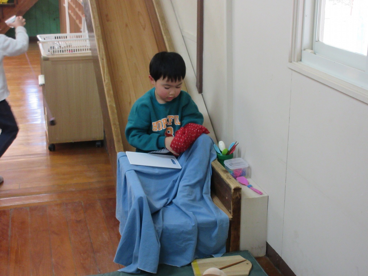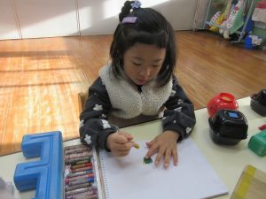 お弁当を持って小学校に行き、自由画帳とクレパスを取り出して、お絵描きのお勉強をしていました。小学校が終わったら、お家に帰って宿題をする姿も見られましたよ😊✨