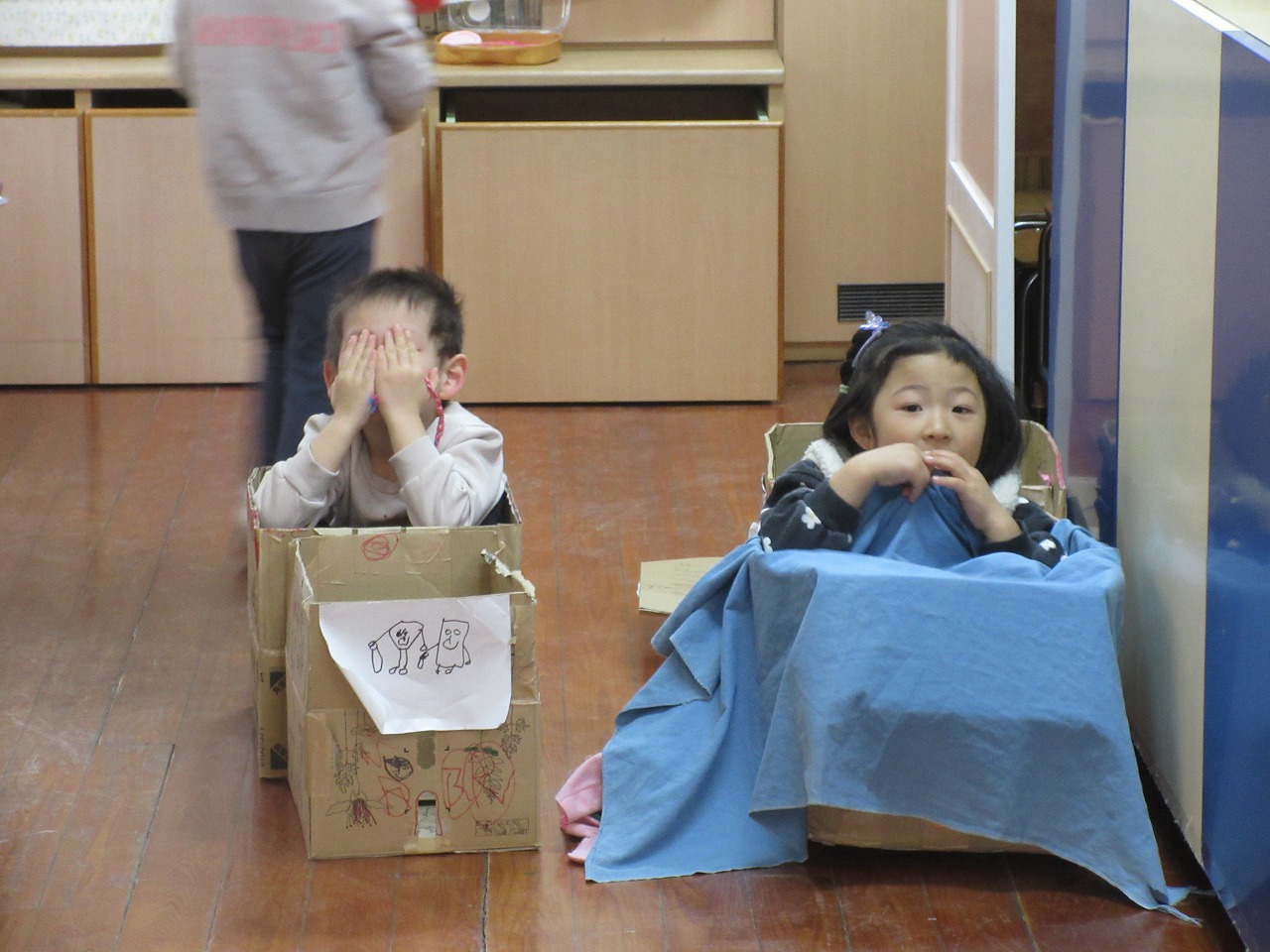 🍀はじめは全員でねこ役を楽しんでいましたが、次第にねこ役・のらねこ大将役・ウヒアハ役と、役割を分担しながら遊ぶ姿が見られるようになりました。子どもたちはこのごっこ遊びを気に入り、何度も繰り返して遊んでいました💖