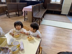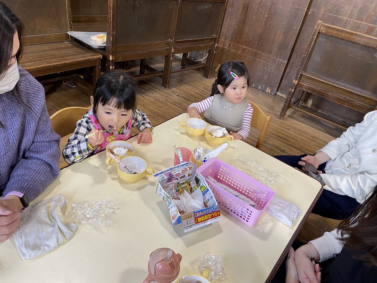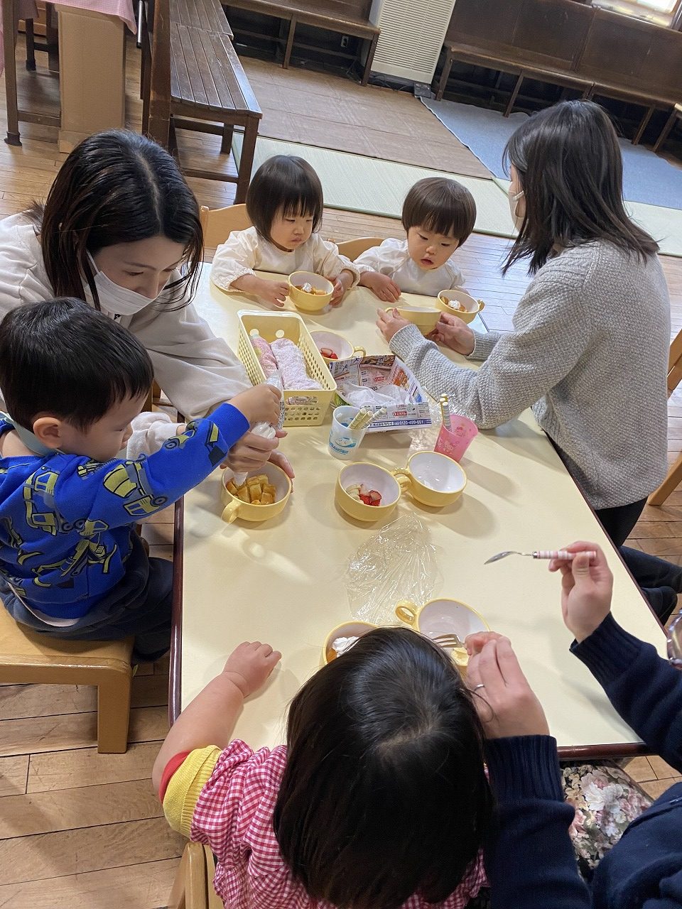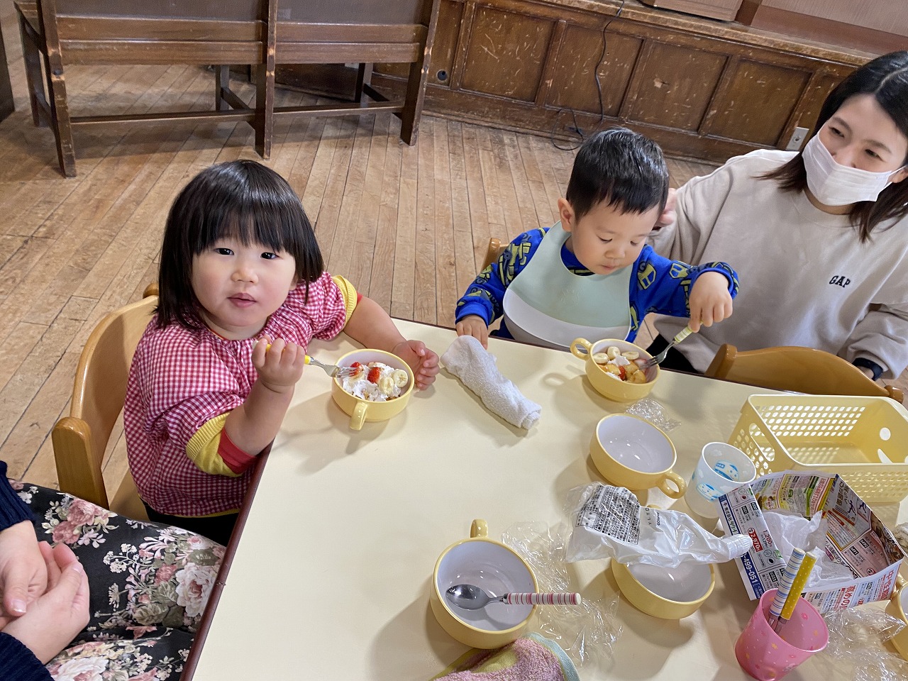 クリームをおかわりするお友達、くだものだけを選んで食べるお友達、それぞれの食べ方で楽しんでいました🍰隣に座るおうちの方の口元へそっとスプーンを運んであげるほほえましい姿も見られました💫