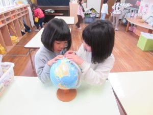 📸 地球儀にも興味が🌏「日本はどこかな?」「一番上は北極だね!」