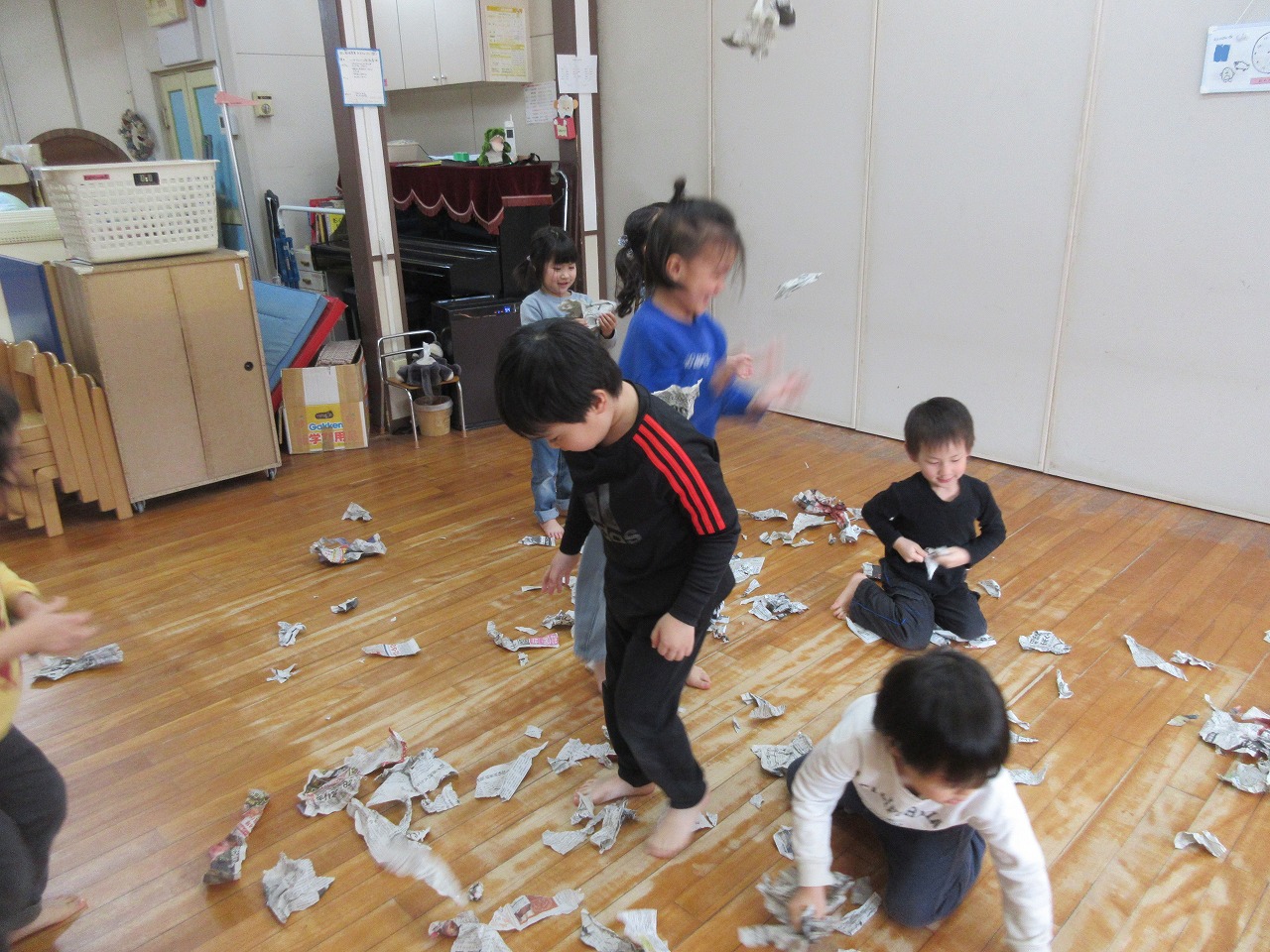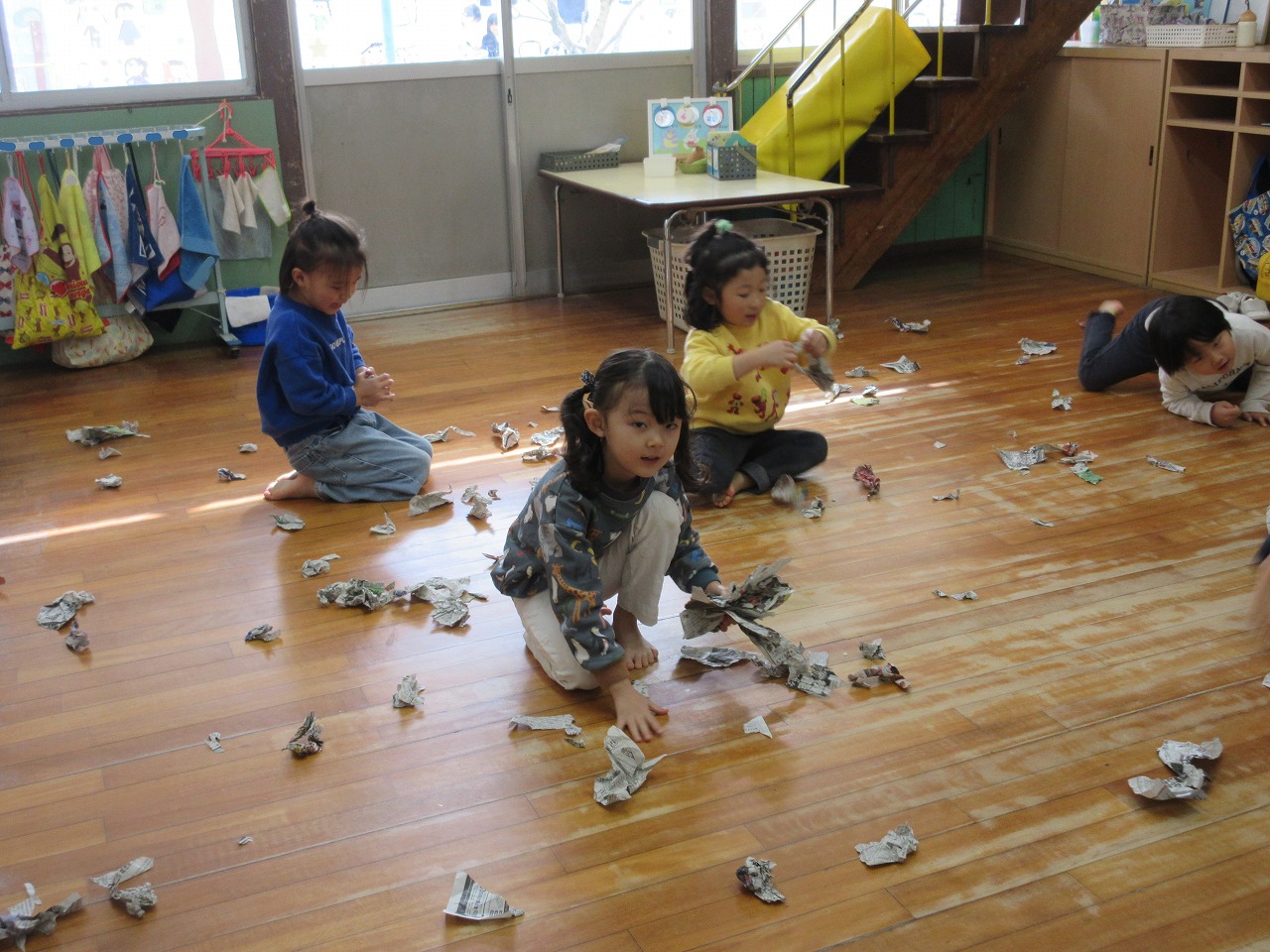 ⭐新聞紙で遊びました。ちぎったりやぶったり、くしゃくしゃにしたり・・・新聞紙の感触を楽しみながら過ごしました😊最後は、袋に新聞紙を集めて、ボールにして遊びました!