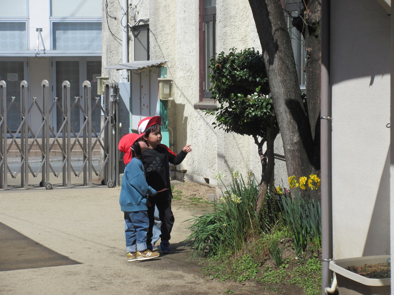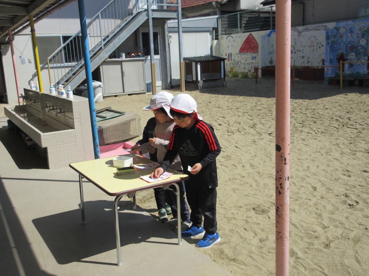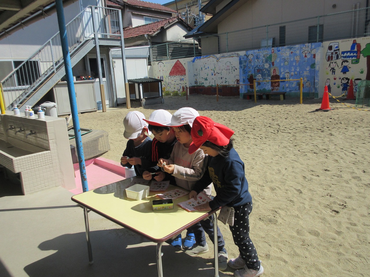 ⭐園庭で春の自然探しをしました🐝「ちゅーりっぷ」、「むし」、「かめ」など・・・見つけたものにシールを貼っていきました😊1月に行った冬の自然探しを思い出しながら、季節の移り変わりを感じている子どもたちでした👦👧