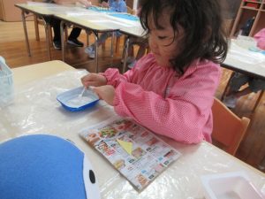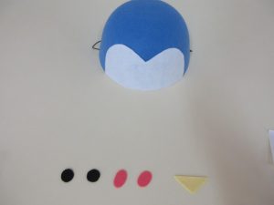 ①ペンギン帽子の土台に、目2つ・ほっぺ2つ・口1つを、ボンドで貼ります🌿