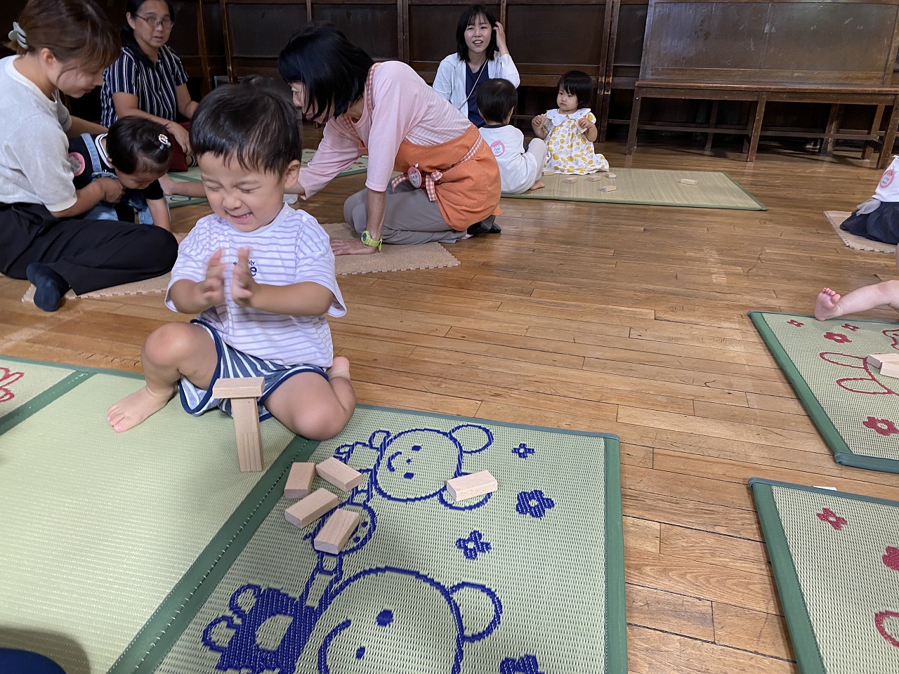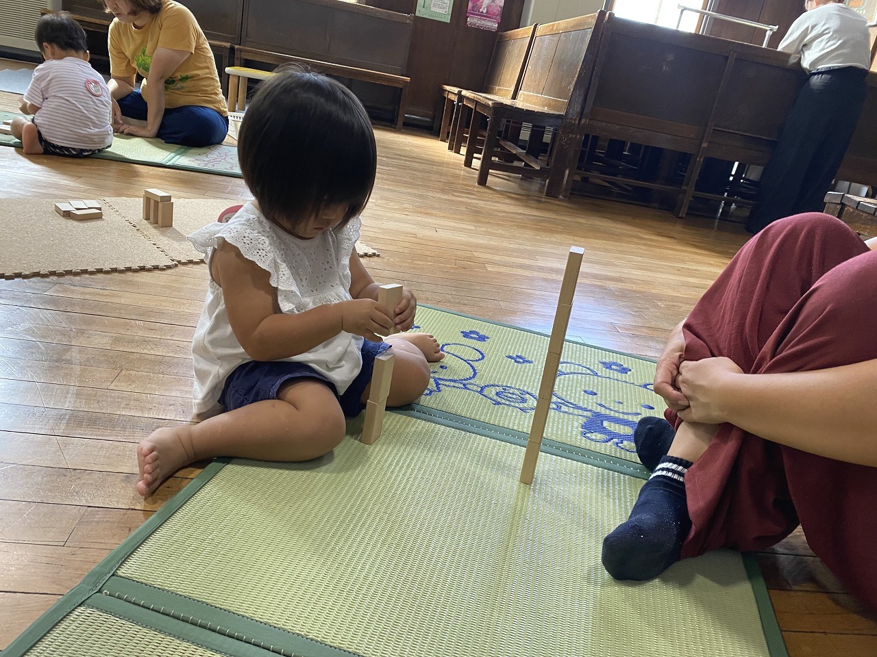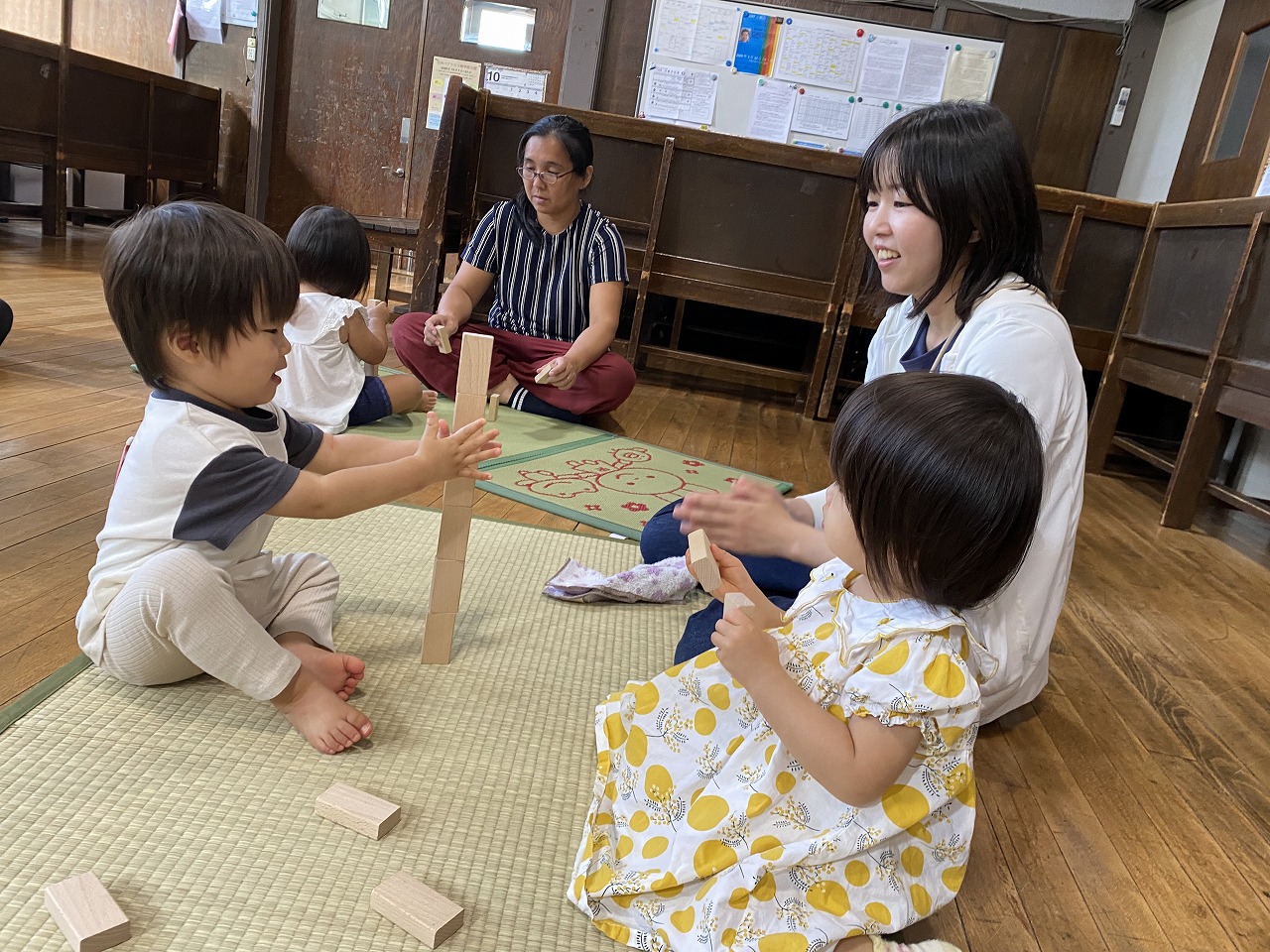 子どもたちは、保護者の組み立てた積木をどんどん壊していきました。しかし、最後の方には、上に重ねることもありました。保護者のマネをして、高く高く積むことに挑戦する子どももいました。