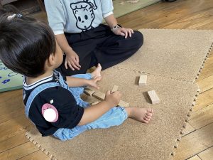 また、最初は積木に興味を示さなかった子どもたちの中には、積木を横にして、「がたんごとんがたんごとん電車🚋がはしります」というと、同じように積木を乗り物に見立てて遊び始める様子も見られました。