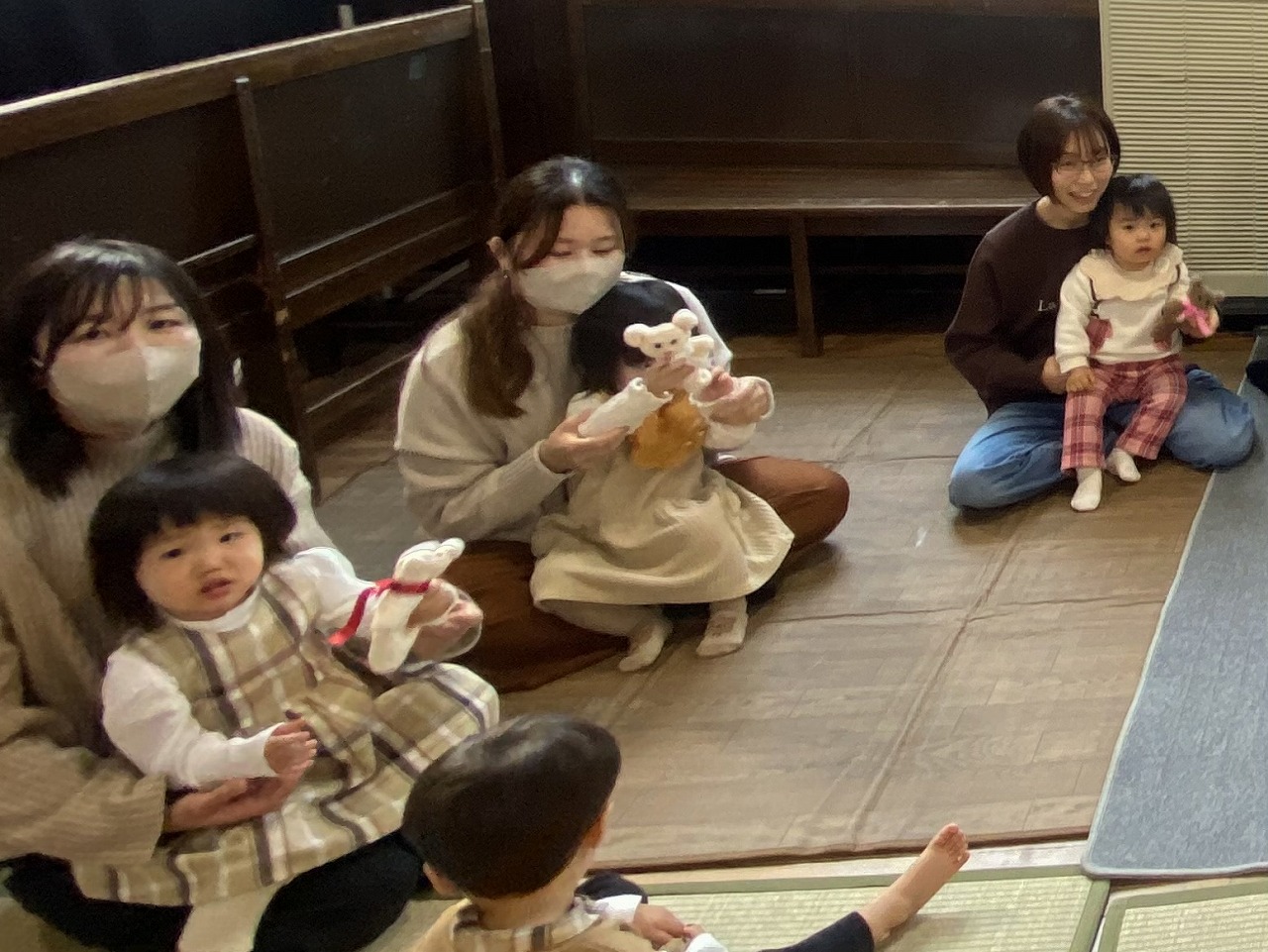 最後に、パペットのくまさんを使って「くまさん🐻の冬のお散歩」のお話をしました。その後、親子でふわふわタオルのくまちゃん🐻人形にシールフェルトの目や口をつけて、好きな色のリボンを選んでくまちゃん🐻人形の首に結びました。それぞれとてもかわいいくまちゃん🐻人形が出来上がり、子どもたちは嬉しそうに持ち歩いていました。
