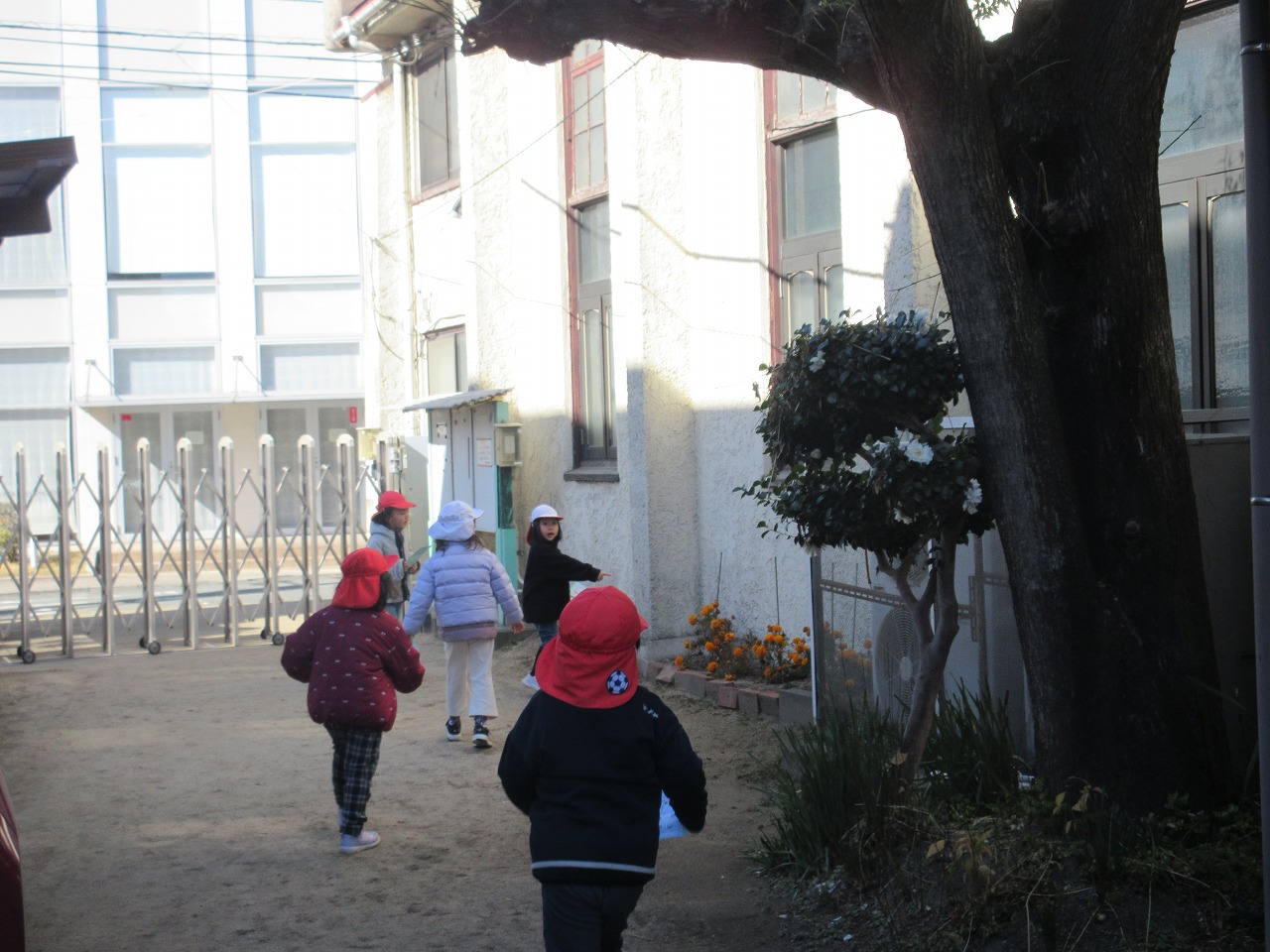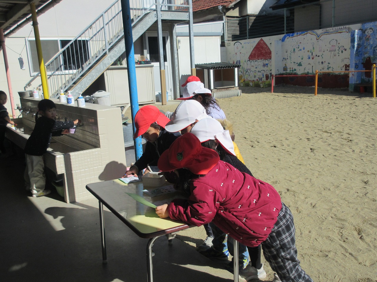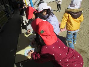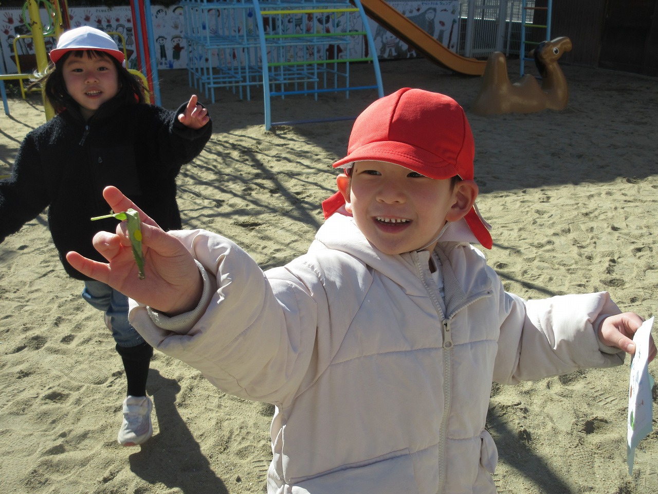 園庭を走り回り、冬の木や花、葉っぱなどを探しました。中には、蛇口をひねって冷たい水を確認しているお友だちもいました👦「あっちにあったよ~!」と、お友だちに教えてあげる優しい姿も見られました😊