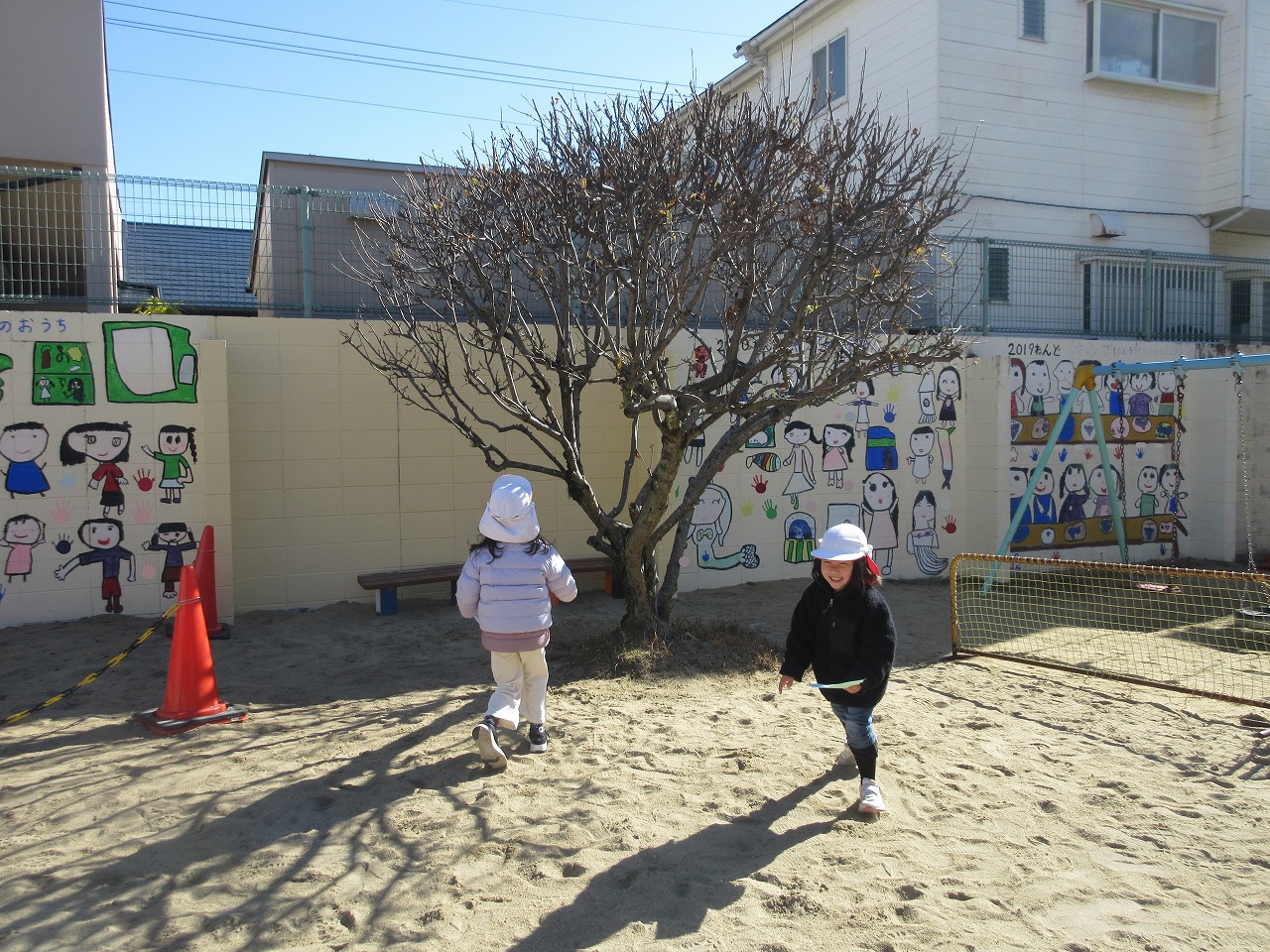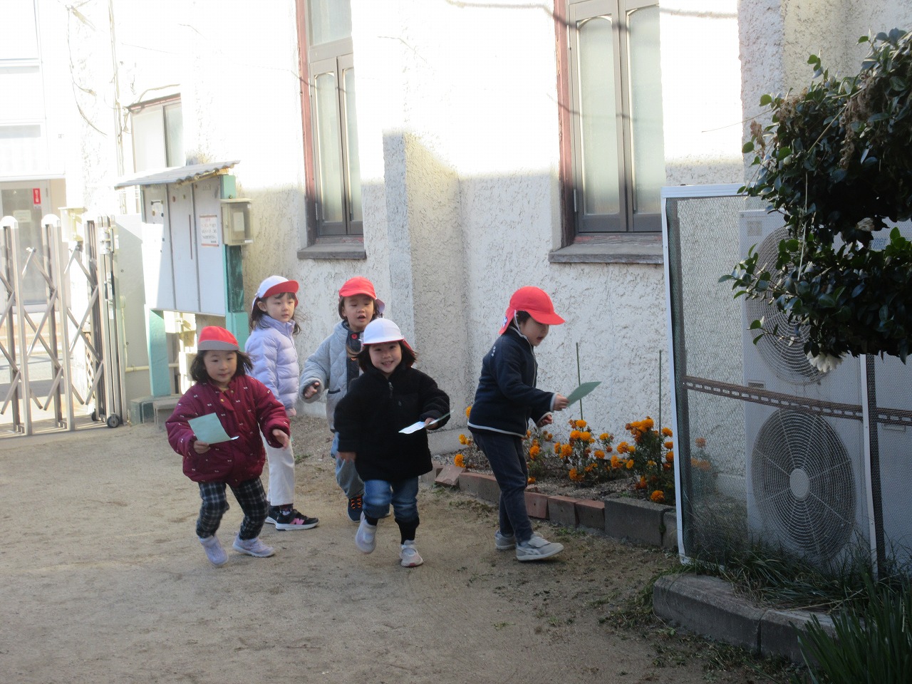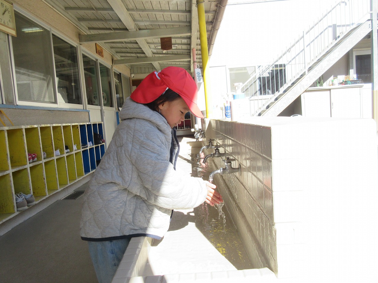 園庭を走り回り、冬の木や花、葉っぱなどを探しました。中には、蛇口をひねって冷たい水を確認しているお友だちもいました👦「あっちにあったよ~!」と、お友だちに教えてあげる優しい姿も見られました😊
