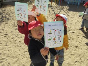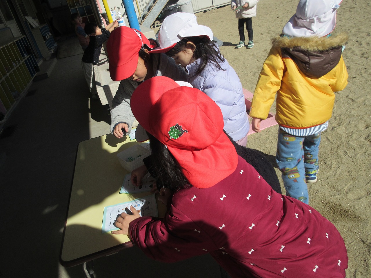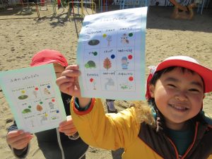 みんなが持っているカードには、「チューリップの芽」、「冬の木」、「冬の鳥」、「カメ」、「葉っぱ」、「冷たい空気」、「スモモの苗」、「冷たい水」、「冬の花」の9つが描いてあります。園庭で探して、シールを集めました。