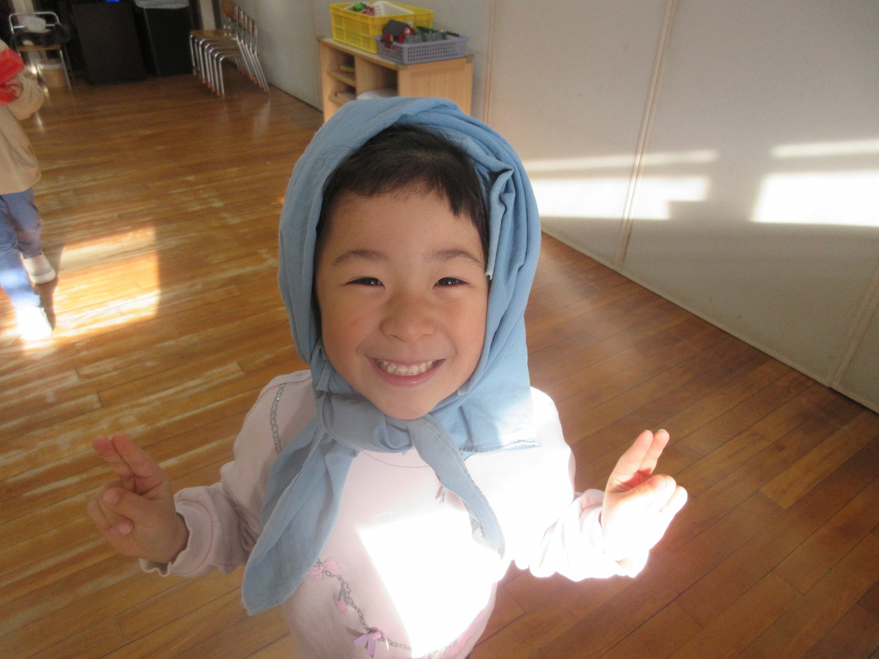⭐大きな布を頭にかぶり、かわいく変身しました💙