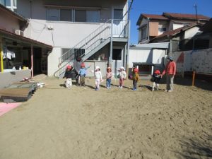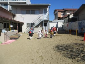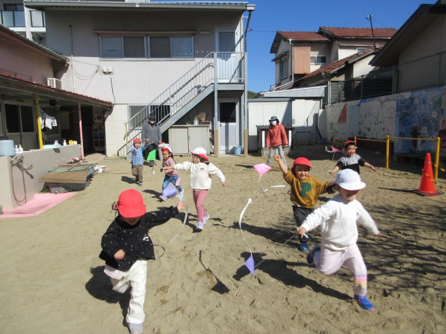園庭で「3、2、1」と言った後にスタートして、走って凧を上げました😁