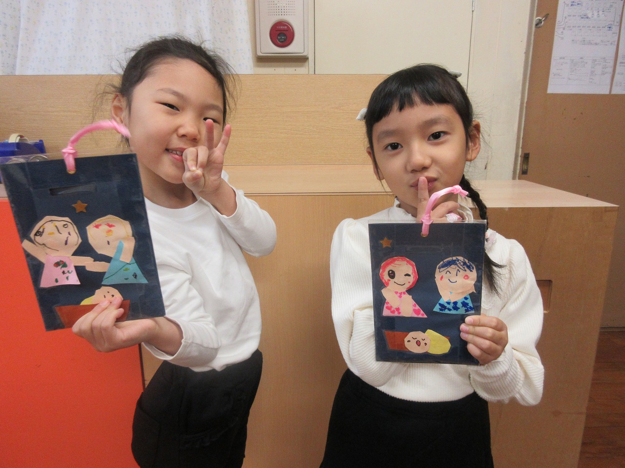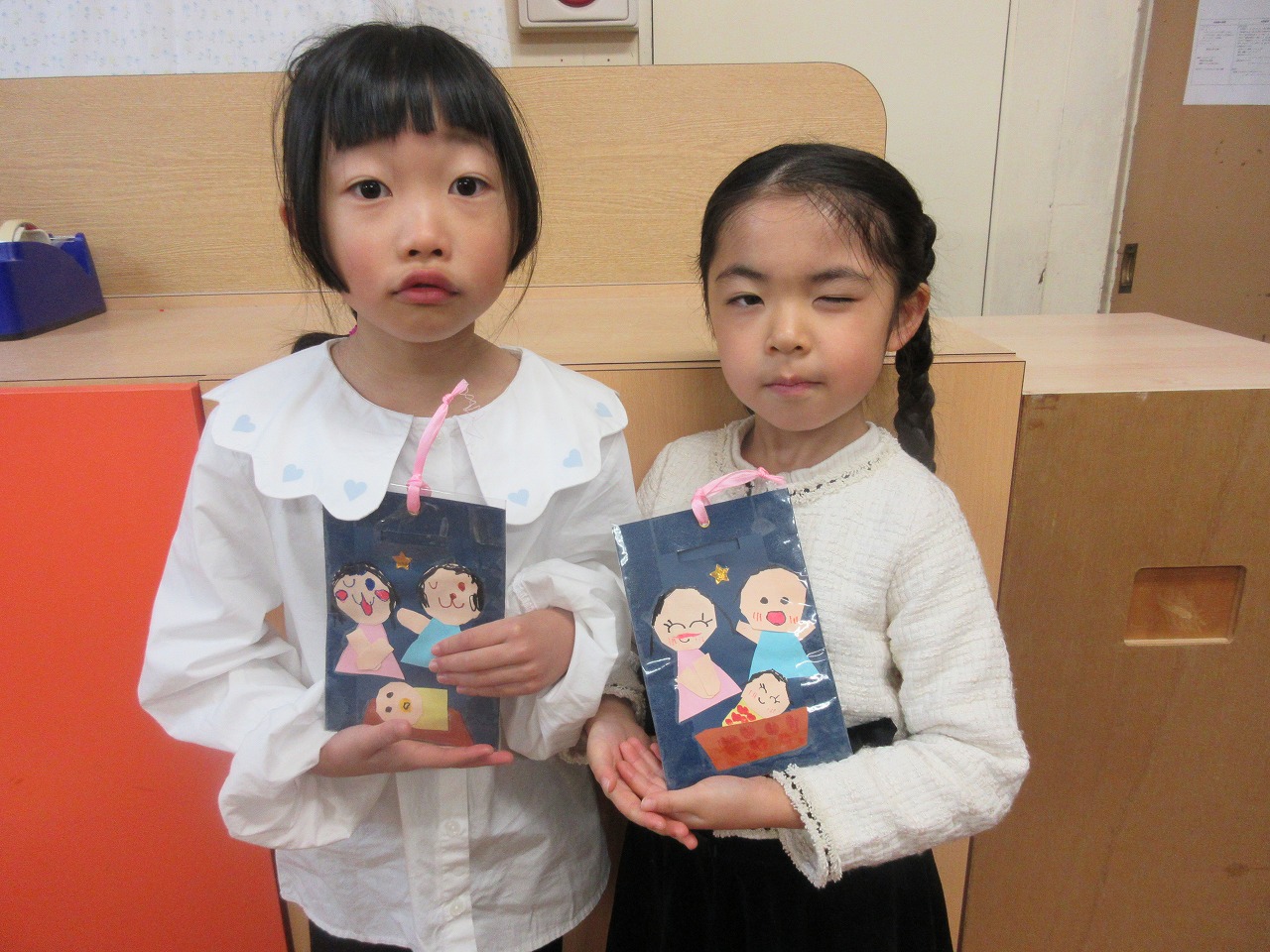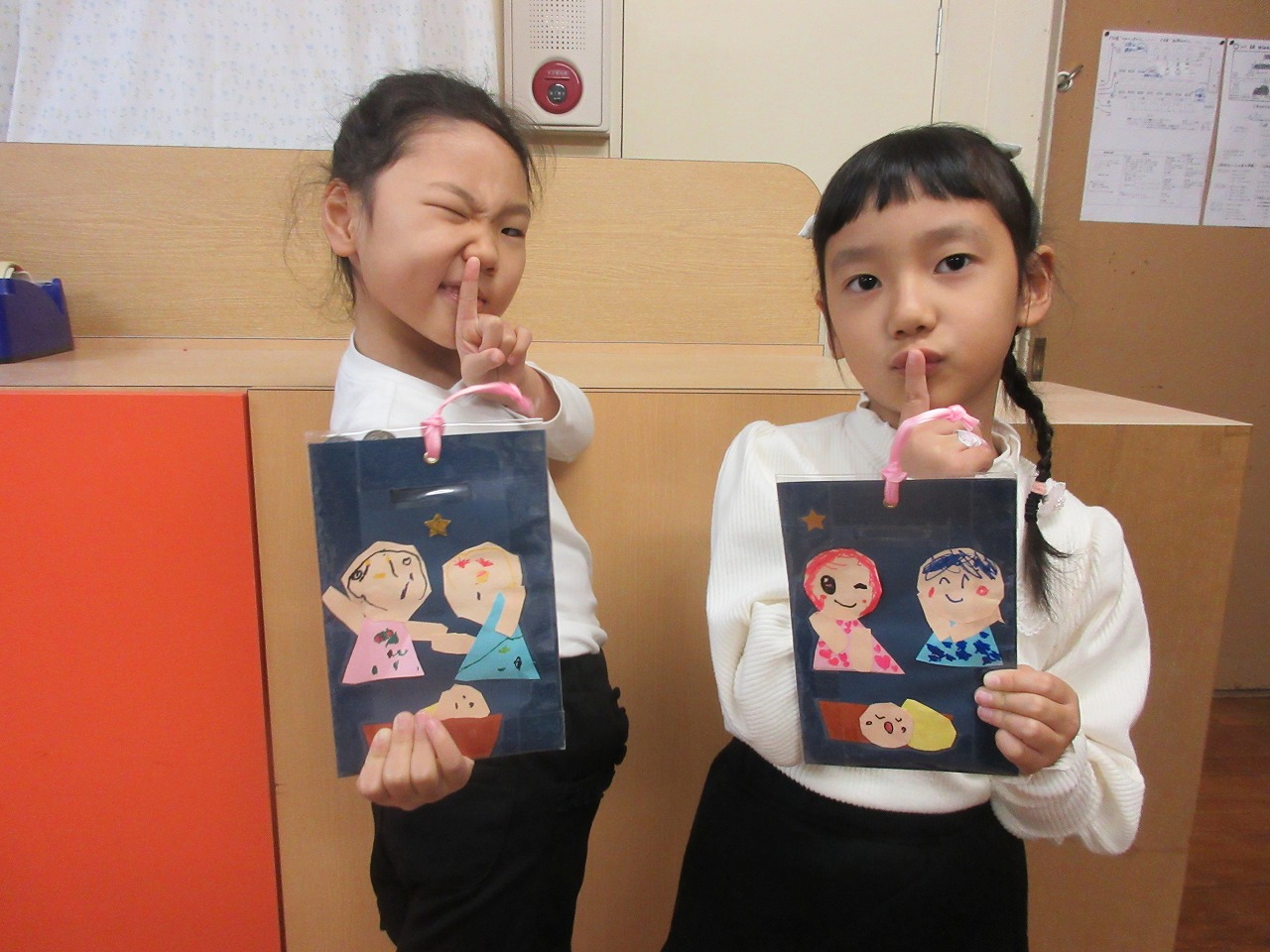 🎄 クリスマス礼拝・祝会に向けて、キャンドルサービスで使用する献金袋を制作しました。画用紙でヨセフ・マリア・イエスさまを切り貼りし、油性ペンで顔を描きました。個性あふれる素敵な作品ができましたね。