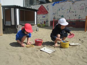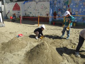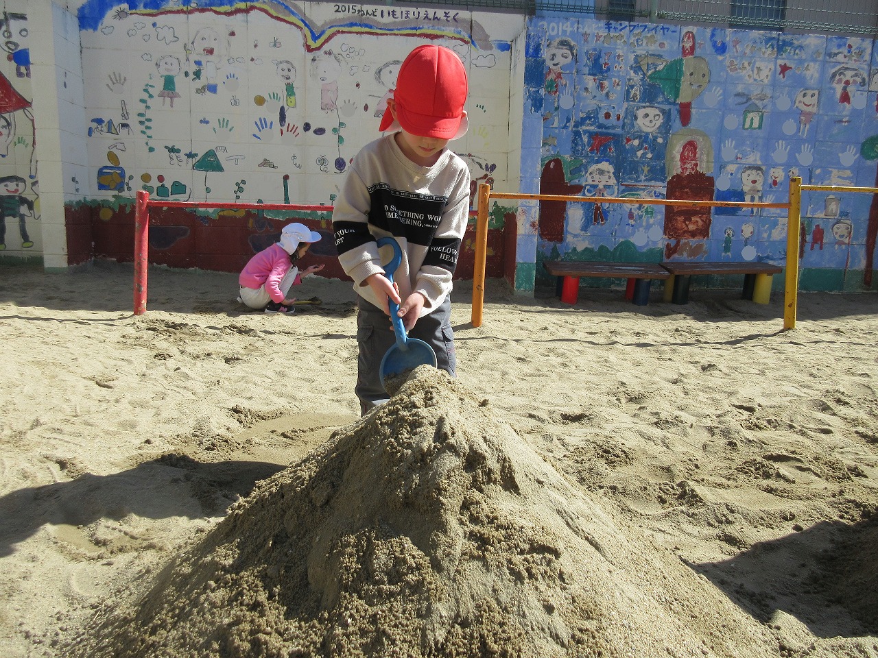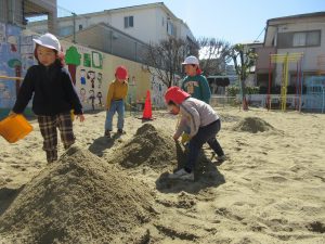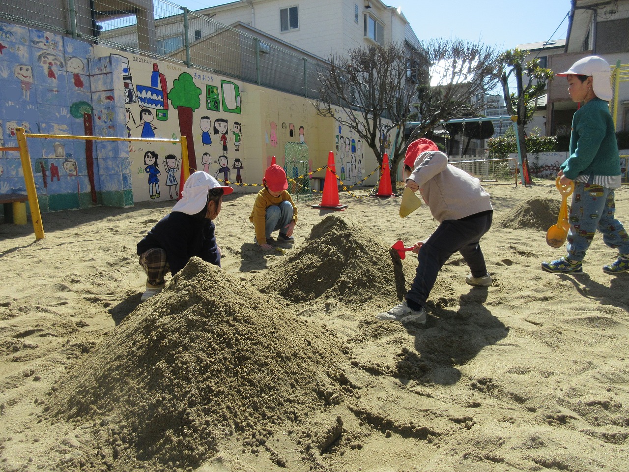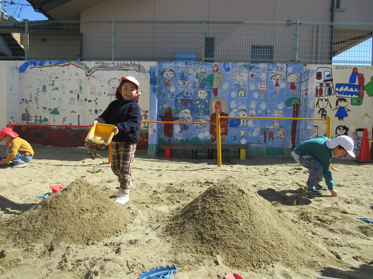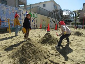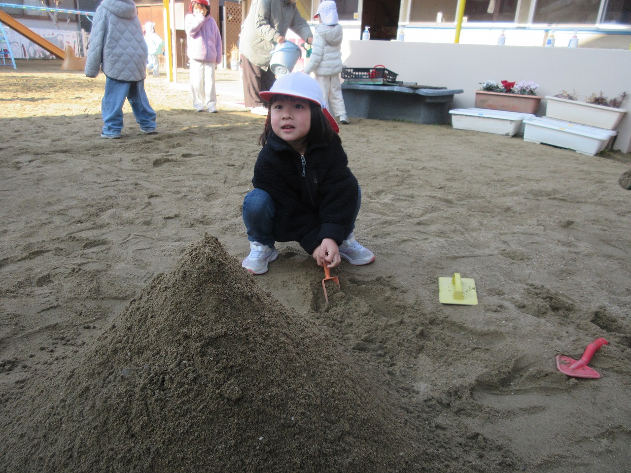 「ふじさんを作ろう!」と、ふじさん作りが始まりました😊スコップやバケツを使って砂を集めると、どんどん山が大きくなっていきました。1つ、2つ、3つ・・・と、山の数も増えました😊みんなで力を合わせて、楽しいふじさん作りになりました🗻💙