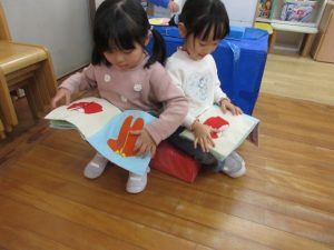 卒園式でプレゼントとしてもらう新約聖書を、園長先生と一緒に開いてみました。