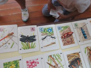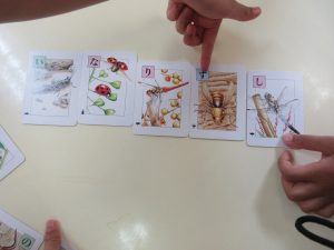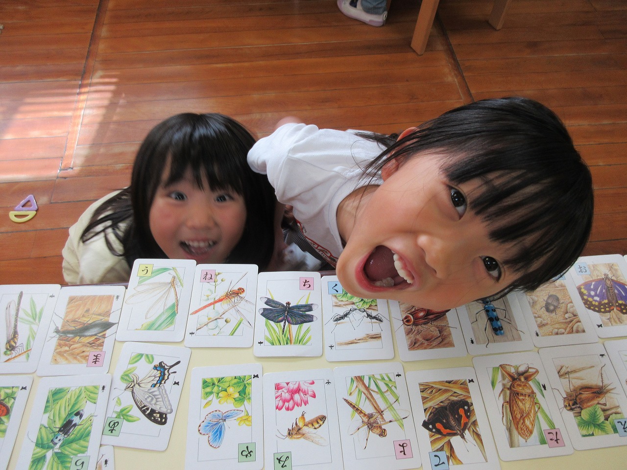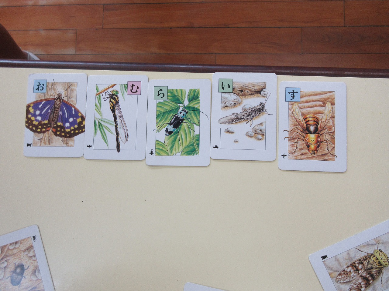 📸 昆虫カードが大好きなお友だち。カードを繋げて言葉を作りました。「おむらいす」、「ちくわ」、「いなりずし」(指が濁点の代わりだそうです😂)